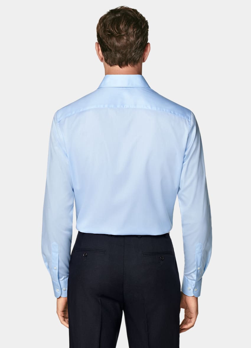 This light blue shirt is tailored to a formal fit and features a classic widespread collar, single cuff, and French placket.